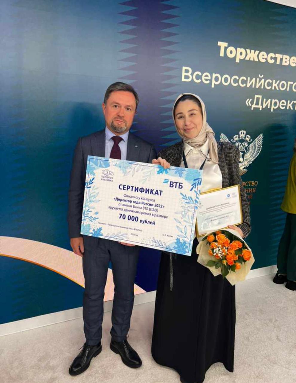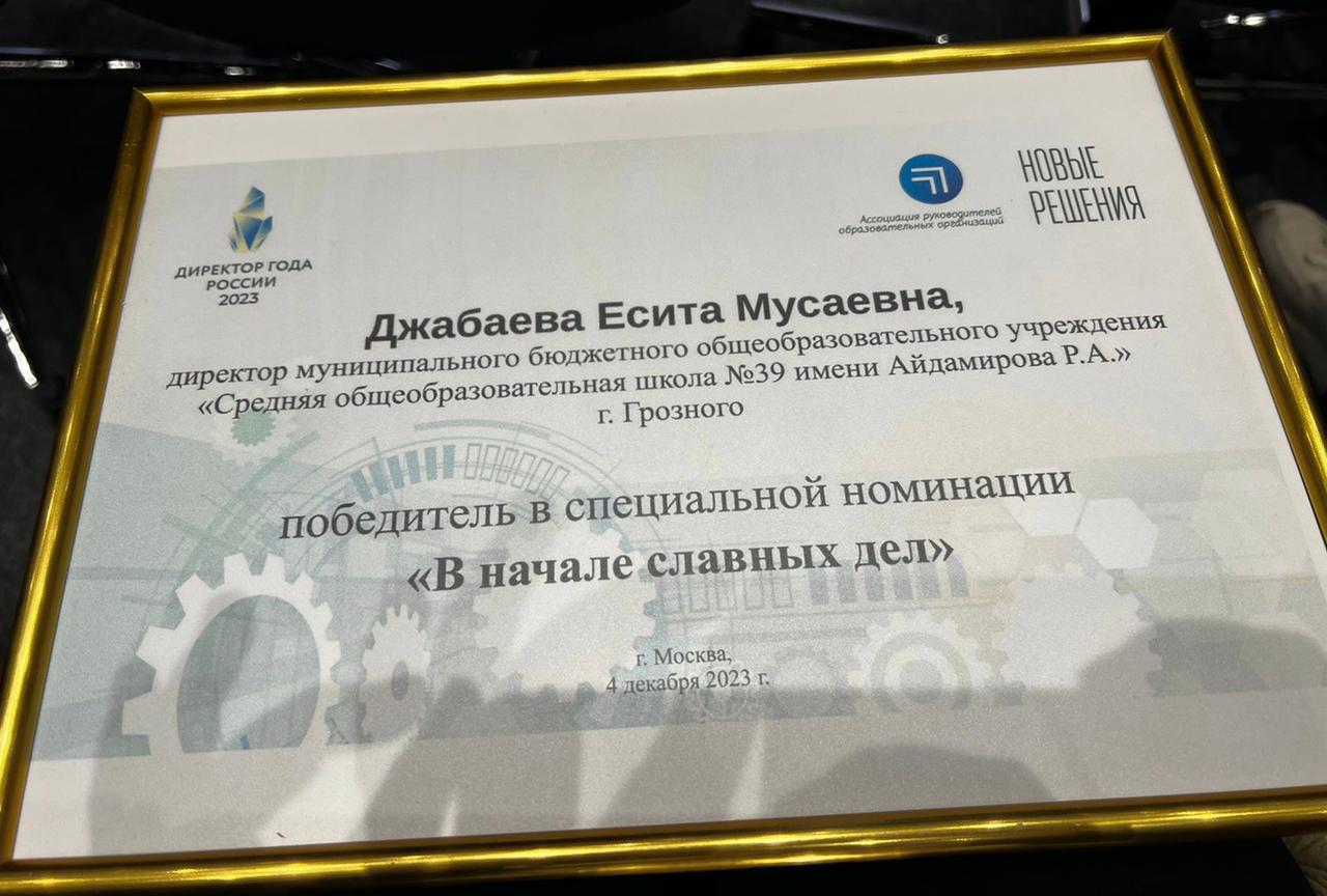 Коллектив МБОУ «СОШ 39 им. Айдамирова Р. А.» г. Грозного от всей души поздравляет директора Джабаеву Еситу Мусаевна с заслуженной победой в номинации «В начале славных дел» во Всероссийском конкурсе «
