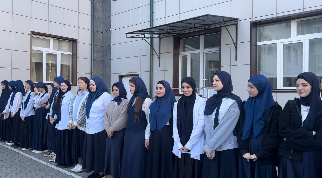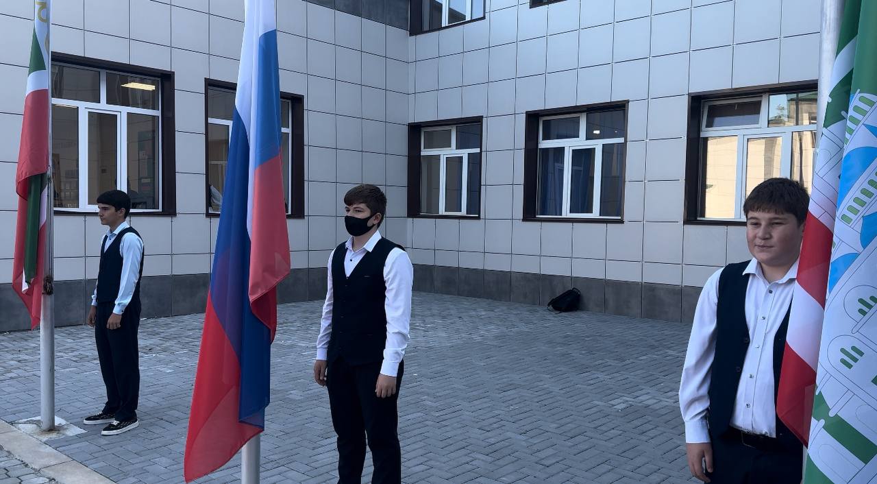 Учебная недели началась с церемонии поднятия государственных флагов и исполнения государственных гимнов Российской Федерации и Чеченской Республики.
