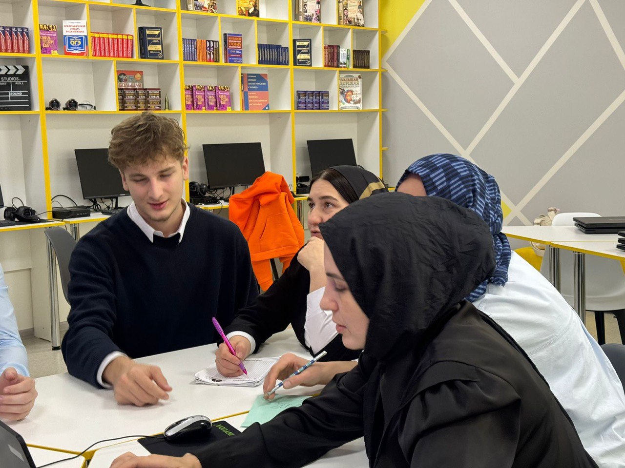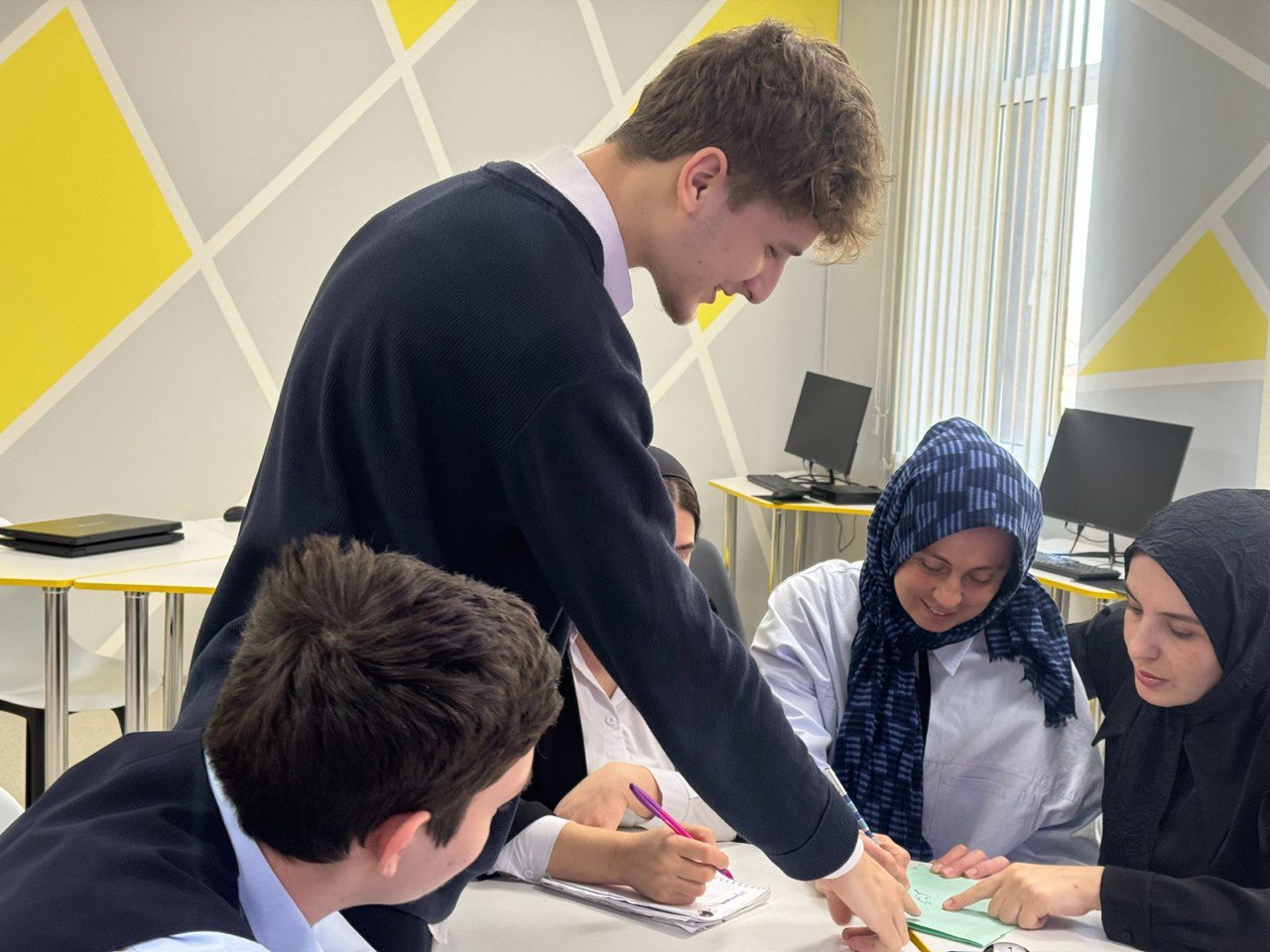 Руководитель проекта, Айдамирова Аминат Аднановна, совместно с педагогическим коллективом школы, рассказала о сути проекта, его ключевых направлениях — коллаборациях, охватывающих журналистику, искусство, науку, технологии и волонтёрство. Особое внимание было уделено роли родителей-наставников и принципу «равный равному», на котором строится взаимодействие внутри проекта.
