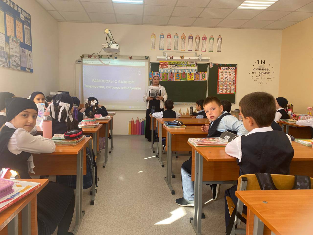 15.09.2025В рамках проекта «Разговоры о важном» в нашей школе прошли занятия на тему «Творчество, которое объединяет». Для начальных классов уроки были направлены на то, чтобы показать детям, как искусство помогает нам лучше понимать себя и других, а также познакомить их с богатой русской культурой. Ребята обсуждали, что такое творчество, узнали о великих русских писателях, композиторах и художниках, а также посмотрели интервью с продюсером Первого канала о международном конкурсе «Интервидение». В интерактивном задании дети сопоставляли музыку Чайковского с картинами русских художников, что помогло им увидеть связь между разными видами искусства.Ученики основной школы глубже погрузились в мир искусства, обсуждая, как музыка, литература и живопись помогают выражать эмоции, сохранять культурное наследие и объединять людей. Они говорили о значении русской культуры в мировом контексте и роли международного конкурса «Интервидение» как площадки для диалога между культурами. В практических заданиях, таких как «Времена года» и «Превращение», школьники развивали креативное мышление и размышляли, как найти вдохновение и развивать свои таланты. Особое внимание уделялось возможностям творческой самореализации молодежи, включая участие в программах «Пушкинская карта» и «Таврида.АРТ».Обучающиеся активно обменивались мнениями и делились своими увлечениями, открывая для себя новые грани творчества. Эти занятия показали, что творчество — это не просто хобби, а настоящий мост между людьми, поколениями и культурами.#ТворчествоОбъединяет #РазговорыОВажном #РусскаяКультура #Интервидение