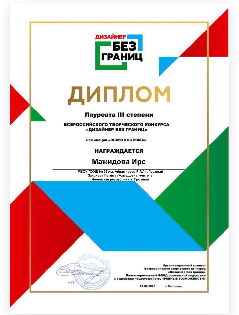 07.09.2025Наш проект приносит свои результаты!Проект «Родительский Альянс: Коллаборации Будущего», реализуемый за счёт денежной премии Российского общества «Знание» при поддержке родительского сообщества МБОУ «СОШ №39 им. Айдамирова Р.А.», уверенно движется вперёд, и его участники уже демонстрируют первые большие успехи! Активный волонтёр коллаборации «Дизайнеры» — Мажидова Ирса стала призёром III степени Всероссийского творческого конкурса «Дизайнеры без границ» . Ирса представила свой индивидуальный проект по дизайну, разработанный в рамках школьной коллаборации. Работа отличалась оригинальностью, высоким уровнем исполнения и отражала творческий потенциал участницы, вдохновлённой наставниками проекта. Мы гордимся достижениями наших ребят и наставников!Каждый успех — это подтверждение того, что «Родительский Альянс» помогает раскрывать таланты, формировать уверенность в себе и вдохновлять новое поколение на великие дела.#РодительскийАльянс #КоллаборацииБудущего #Школа39 #Грозный #Дизайн #Творчество #Конкурс #Достижения #Образование#РоссийскоеОбществоЗнание #ЗнаниеРодители #ЗнаниеПремия