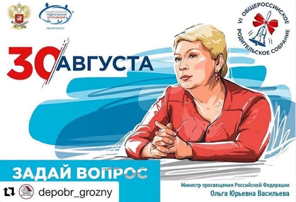 30 августа 2019 года в одной из школ Санкт-Петербурга состоится встреча Министра просвещения Российской Федерации Васильевой О.Ю. с родителями школьников.⠀ Общение пройдет в формате живого диалога и видеоконференции с прямыми включениями из разных регионов страны.⠀ Благодаря онлайн-трансляции за Общероссийским родительским собранием можно следить из любой точки страны и мира.⠀ Уже сейчас любой желающий может направить вопрос через форму на сайте (перейти на страницу) и через аккаунты Министерства просвещения Российской Федерации в социальных сетях. Наиболее острые из них станут предметом обсуждения в ходе собрания.